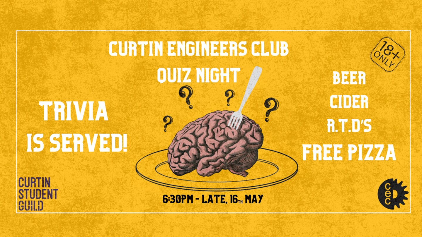 The Curtin Engineers Club Annual Quiz Night is here! 🥳 Test your knowledge, and witt, with trivia, drinks and pizza! Quiz night features general knowledge topics so anyone is welcome to attend. 🙌